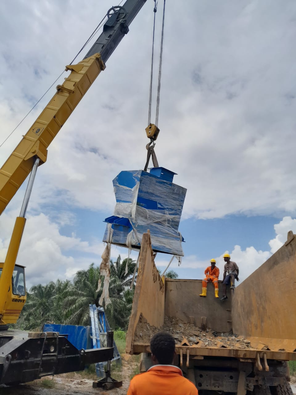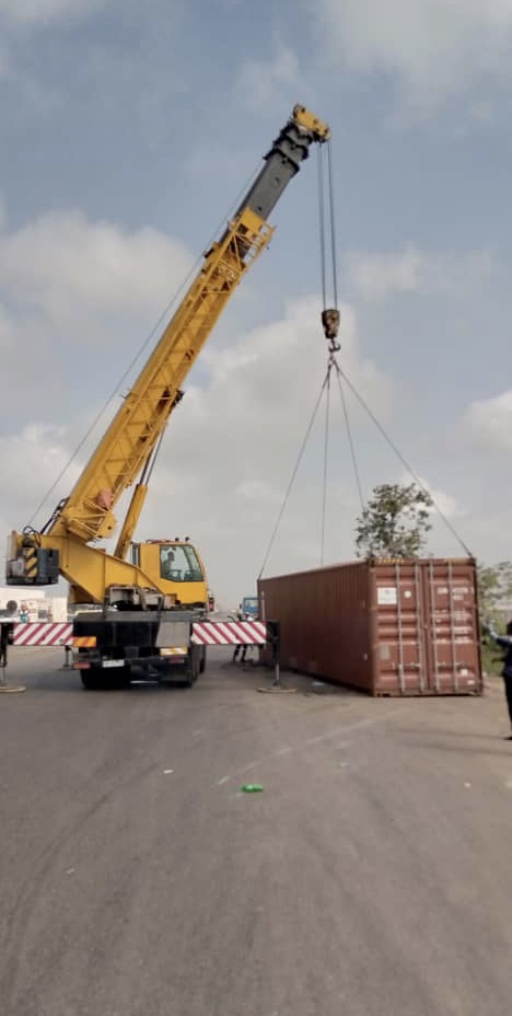 Crane offloading container at Climax Lubricants Industries, Interchange, Lagos/Ibadan Expressway, Ogun state.